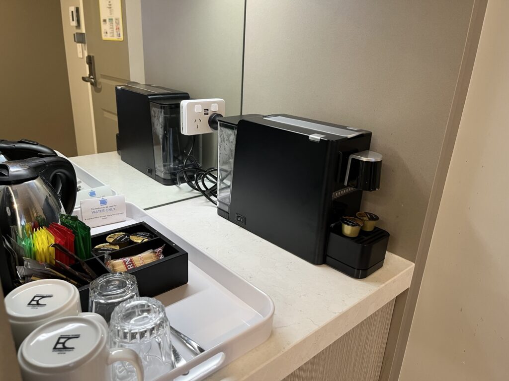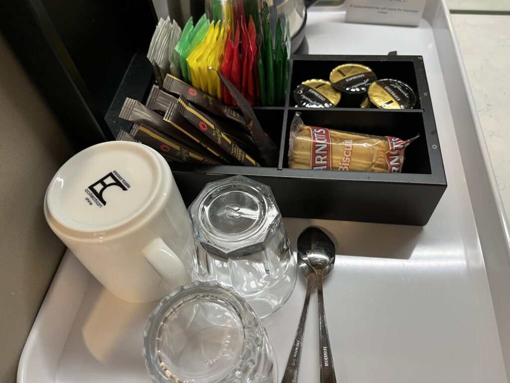 エスプレッソが作れるコーヒーマシーンがある他、紅茶やハーブティーのティーバッグが何種類も用意されていました。